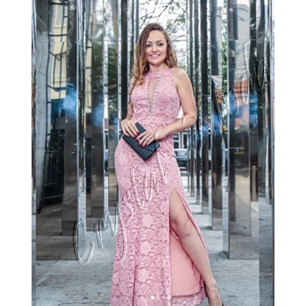 Vestido longo de best sale renda com fenda